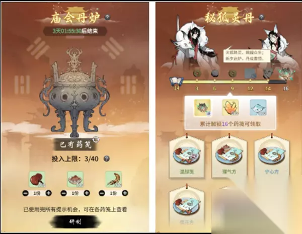 【龙骨笺】6千年灵芝+ 2百年玄黄+ 3万年人参 【万木回春方】3千年灵芝+ 5百年玄黄+ 2万年人参 【天罡固本笺】4千年灵芝+ 6百年玄黄+ 1万年人参 【强功方】3千年灵芝+ 2百年玄黄+ 1万年人参 【萱草忘忧方】9千年灵芝+ 6百年玄黄+ 3万年人参 【冲霄玄冥笺】2千年灵芝+ 8百年玄黄+ 8万年人参 【道心魔种方】5千年灵芝+ 7百年玄黄+ 4万年人参 【补中益气方】10千年灵芝+ 3百年玄黄+ 3万年人参 【玄参白术笺】6千年灵芝+ 1百年玄黄+ 7万年人参 【星辰纵横方】3千年灵芝+ 9百年玄黄+ 2万年人参 【玉清祈灵方】2千年灵芝+ 2百年玄黄+ 13万年人参 【奇门遁甲方】6千年灵芝+ 5百年玄黄+ 4万年人参 【三花聚顶笺】3千年灵芝+ 7百年玄黄+ 5万年人参 【化精生元方】5千年灵芝+ 10百年玄黄+ 4万年人参 【温里固涩笺】10千年灵芝+ 9百年玄黄+ 3万年人参 【六神宣气方】7千年灵芝+ 6百年玄黄+ 9万年人参 【顺气平脉方】3千年灵芝+ 9百年玄黄+ 11万年人参 【四逆生脉方】1千年灵芝+ 8百年玄黄+ 12万年人参 【活气方】6千年灵芝+ 8百年玄黄+ 9万年人参 【神明度命笺】8千年灵芝+ 21百年玄黄+ 9万年人参 【万物资生笺】12千年灵芝+ 15百年玄黄+ 11万年人参 【玄天如意方】18千年灵芝+ 4百年玄黄+ 3万年人参 【天地盈虚笺】2千年灵芝+ 24百年玄黄+ 13万年人参 【雾露乾坤笺】10千年灵芝+ 8百年玄黄+ 17万年人参 【任自逍遥方】14千年灵芝+ 12百年玄黄+ 5万年人参 1.玩家们可以根据想要制作的丹药来选择丹药配方制作,根据配方来选择材料,材料均是由千年灵芝、百年玄黄、万年首无来制作的,只不过是数量的要求不太一样。每制作一味丹药之后就可以获得一份奖励,有需要的玩家们可以保存该表使用。 2.通过挂机获得三种不同的药材,再把三种不同的药材通过配比得到不同的药笺,每个药笺都有一个正确的配比,累计解锁药笺数量获得奖励! 3.来到庙会深处,一个巨大丹炉映入眼帘。隔壁还站着一个高挑动人的天狐姐姐,再看看隔壁的丹方奖励,小师妹已经按捺不住激动的心情!新岁启炉,丹成香恒。破解丹方数学玄机,赢取丰富奖励!