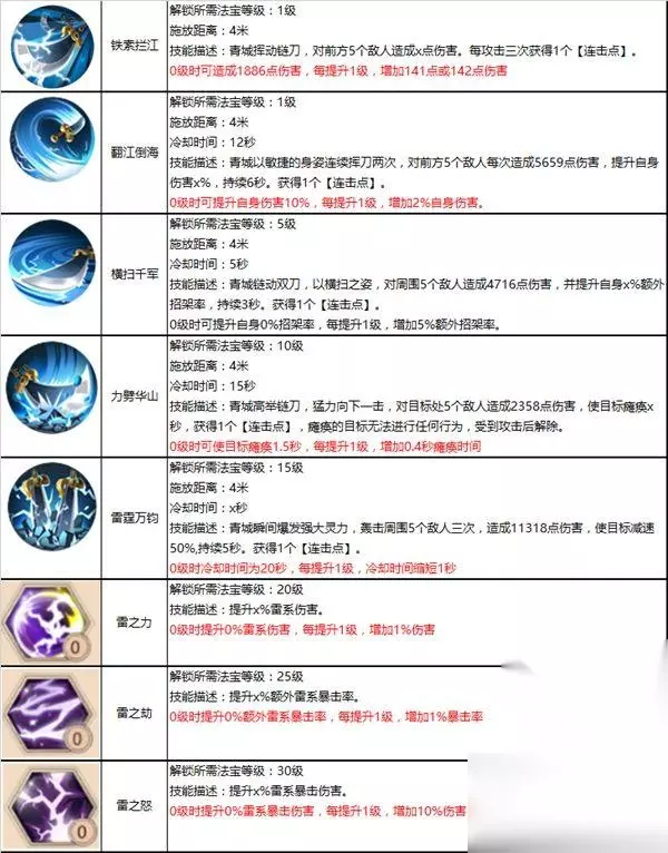 如果您使用的是镰刀,我建议您优先加满雷之劫和雷之怒,这样就可以最快的把暴击伤害和暴击率提到最高,随后点满翻江倒海和力劈华山以提高控制能力和输出能力。 匕首: