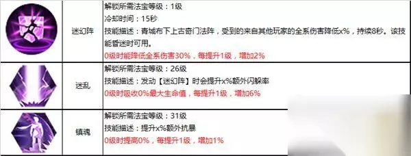 出于提高生存能力的考量,我们优先加满迷乱,这样一来既可以提高躲闪率又能增加最大生命值,可谓一石二鸟,之后我们点满迷幻阵,进一步提高减伤,增加开启后的生存能力。 太乙靴:
