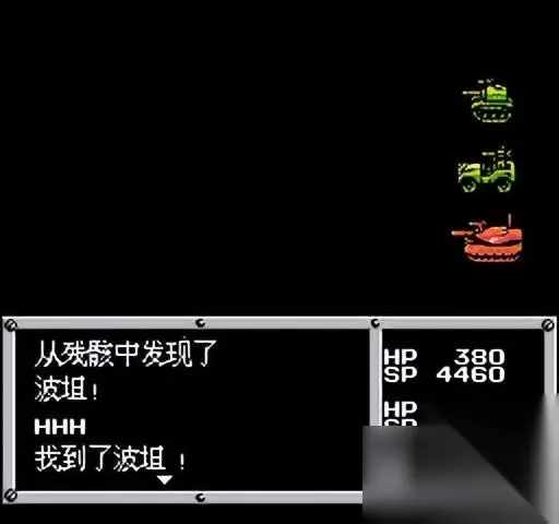 进去之后就一路逃走。如果没血了,在打战狗之前先补充一下血量,保证还有30生命值。 战犬洞1F宝箱:参丸 战犬洞二楼宝箱:59G,古币,108G,皮衣 触发战斗,选择防御,第三回合直接跑掉(可以留战狗,后面再用红狼)。剧情结束后,得到1号车: