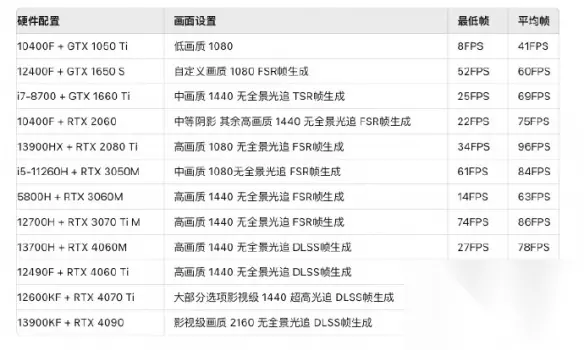 二、各分辨率配置需求 1080P 高画质推荐6650xt和4060以上显卡 全景光追推荐4060 2k 高画质推荐4060ti/7700x以上显卡 高画质全景光追推荐4070 4K 高画质推荐4070s起步 高画质全景光追推存4080S