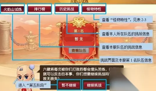 第四阶段:力破六健将(挑战版) 战斗结束后出现【火焰山试炼】可选择暂不继续进入“第五阶段”或者维续挑战六健将 ①连打3场建议开好秘制,管挑战成功与否都会进入“第五阶段” ②挑战六健将,在3场战斗中怪物能力不断增强