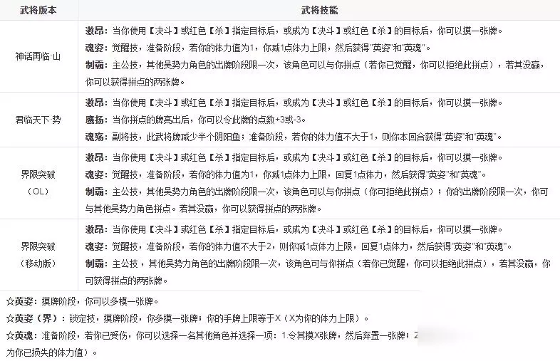 在游戏《三国杀》中,武将孙策的技能英姿和英魂是觉醒技魂姿的衍生技能,只有在发动了魂姿后才能获得这两个技能,否则无法使用它们的效果。英姿来源于周瑜的技能,英魂来源于孙坚的技能。 魂姿:觉醒技,准备阶段,若你的体力值为1,你减1点体力上限,然后获得"英姿"和"英魂"。 英姿:摸牌阶段,你可以多摸一张牌。 英魂:准备阶段,若你已受伤,你可以选择一名其他角色并选择一项:1.令其摸X张牌,然后弃置一张牌;2.令其摸一张牌,然后弃置X张牌(X为你已损失的体力值)。
