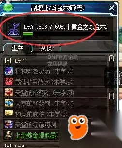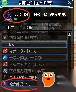 dnf炼金术师快速升级方法 1.随着近期活动让团本材料的获取难易降低,以及即将到来的低保材料的增加,会加快90B,小贪食升级大贪食等装备升级。我们渐渐的发现升级装备最贵的东西不是小铁柱的火炉卷,而是金色小晶体。升级装备一件就要上千个金色小晶块。 2.毕竟不是人人都是土豪啊,没法痛快买买买啊。不过没关系,今天为大家带来一个可以产出金色小晶块的方法,弄一个给力的副职业:炼金术师。虽然其他副职业也有可玩之处,原谅我这一生不羁放纵爱自由,站街挂机类副职业的不适合我。 3.并且我是个刷图党,对于斗神,顶级力量等药剂需求比较大。做点药剂上架拍卖行,赚点零花还是不错的。副职业的专属导师NPC,是亚贝罗,位置在大地图的贝尔玛尔南部,达芙妮的右侧。点击亚贝罗就能获取炼金术师的任务,100个无色小晶块就能变身成炼金术师啦!如下图。