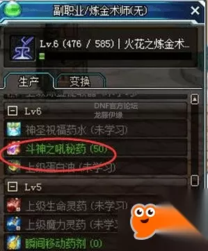 到达炼金6级后,我们只制作斗神之吼药剂。材料是勇士之吼药剂和无色小晶块。大概点击生产80个勇士之吼,就能升到7级炼金等级了。