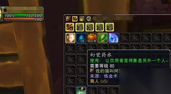 魔兽世界幻觉药水作用介绍 幻觉药水通常用于逃避敌人的攻击或者暂时躲避一些难以处理的情况。它也可以用于在 PvP 战斗中欺骗敌人,但是,请注意,在使用幻觉药水时,玩家仍然可以被其他玩家攻击; 药水效果 1、服用药水的角色会想变换了一个人,使得这个人物外貌上全变换,在对战中可以迷惑别人,从而躲避敌人的攻击; 2、作用是会将你变换离你距离最近的一个角色的相貌,它能够在游戏中有着俩分钟的超长时间作用,可以做出一些意想不到的事情;