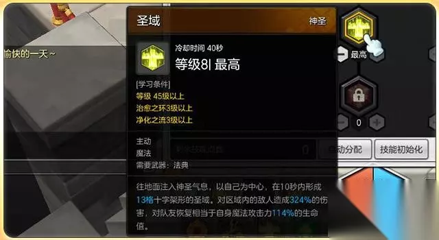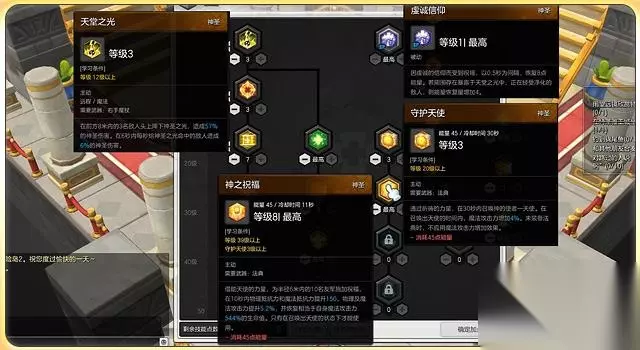 圣域这个技能必须加满!这个技能算是牧师的主要强力攻击技能,而且拥有不俗的治疗效果,虽然这个技能对释放位置有所要求,但是这个技能没有能量消耗,可以当做常用技能使用。