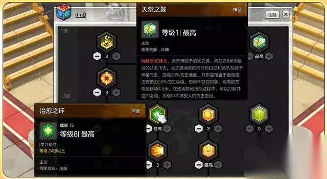 治愈之环建议点满,这里我们把治愈之环和天堂之翼放在一起,主要是因为这两个技能可以连用:等boss释放大招后,利用天堂之翼的快速移动到队友身边,连按治愈之环补给生命垂危的队友,可以起到急救的效果!