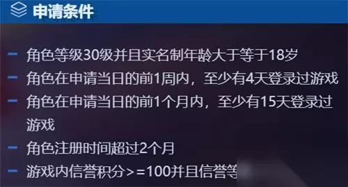 申请条件: 角色等级30级并且实名制年龄大于等于18岁 角色在申请当日的前1周内,至少有4天登录过游戏 角色在申请当日的前1个月内,至少有15天登录过游戏 角色注册时间超过2个月