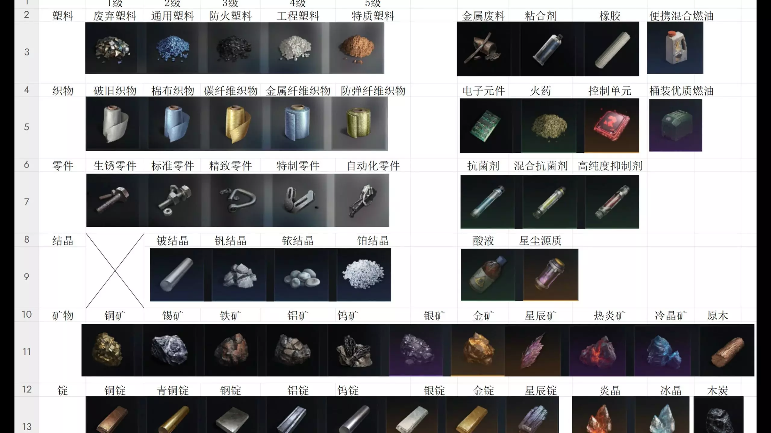 本集主要介绍各种基础资源的获取方式以及用途,因为世界频道里面经常有萌新问某某材料怎么来的,特此制作表格并制作视频,表格待完善后可以发布链接给大家共享。