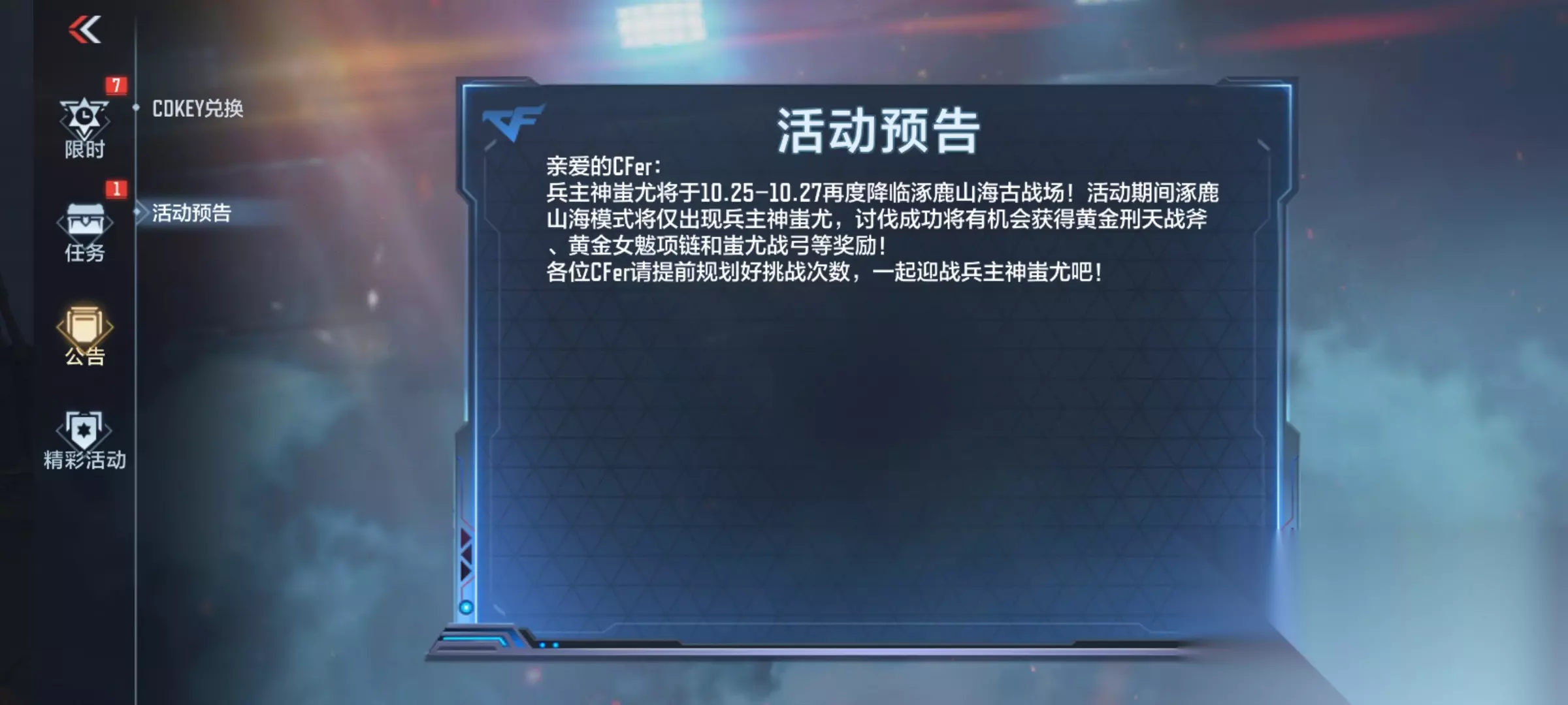 穿越火线-枪战王者【活动分析】兵主神蚩尤再度降临,多重豪礼任君取!如下: 哈喽,各位CFer大家好!全新涿鹿山海版本上线有一段时间了,大家都刷到了自己心仪的奖励了吗?但有的CFer总是抱怨兵主神蚩尤堕神卡太难获取了,这不兵主神蚩尤即将再度降临涿鹿山海古战场!那么本期内容就带大家了解一下这次的降临活动,话不多说,火速发车~