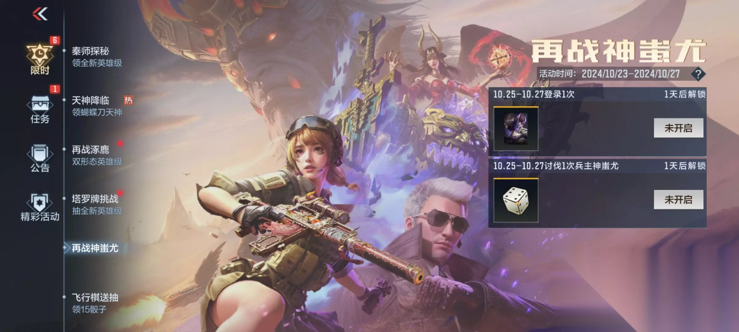 【再战神蚩尤活动】 与此同时,游戏也会同期上架再战神蚩尤活动,玩家在10.25-10.27登录游戏即可领取一张兵主神蚩尤卡堕神卡,完成一次兵主神蚩尤击杀即可免费领取一颗王者之骰,整体来说任务难度不大,参与即可免费领取奖励。