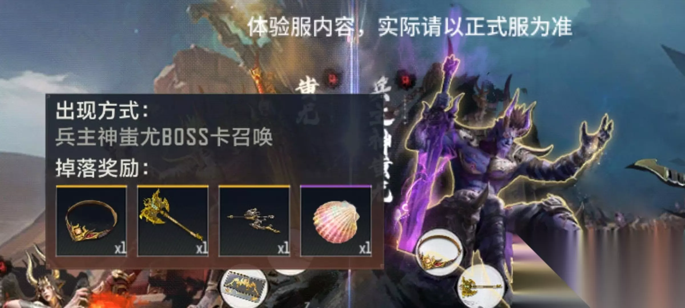 【奖励分析】 兵主神蚩尤在掉落物可以掉落黄金女魃项链和黄金刑天战斧的零件或成品,以及蚩尤战弓、五色贝等强力道具。