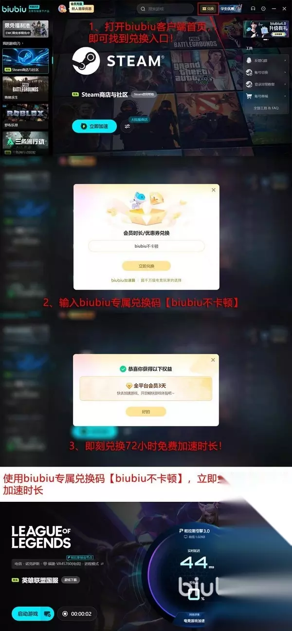 对于新玩家或者是想要体验其效果的人来说,它也是很友好的,提供了充足了免费试用时长,新用户在注册后会自动领取24小时的加速时间,这个是自动领取的,不论是否使用都会过期。但不用担心,还可以使用“biubiu不卡顿”兑换码来换取3天的免费加速时长,这个对新老用户都有效果,不过之只能使用一次,而且要区分大小写。