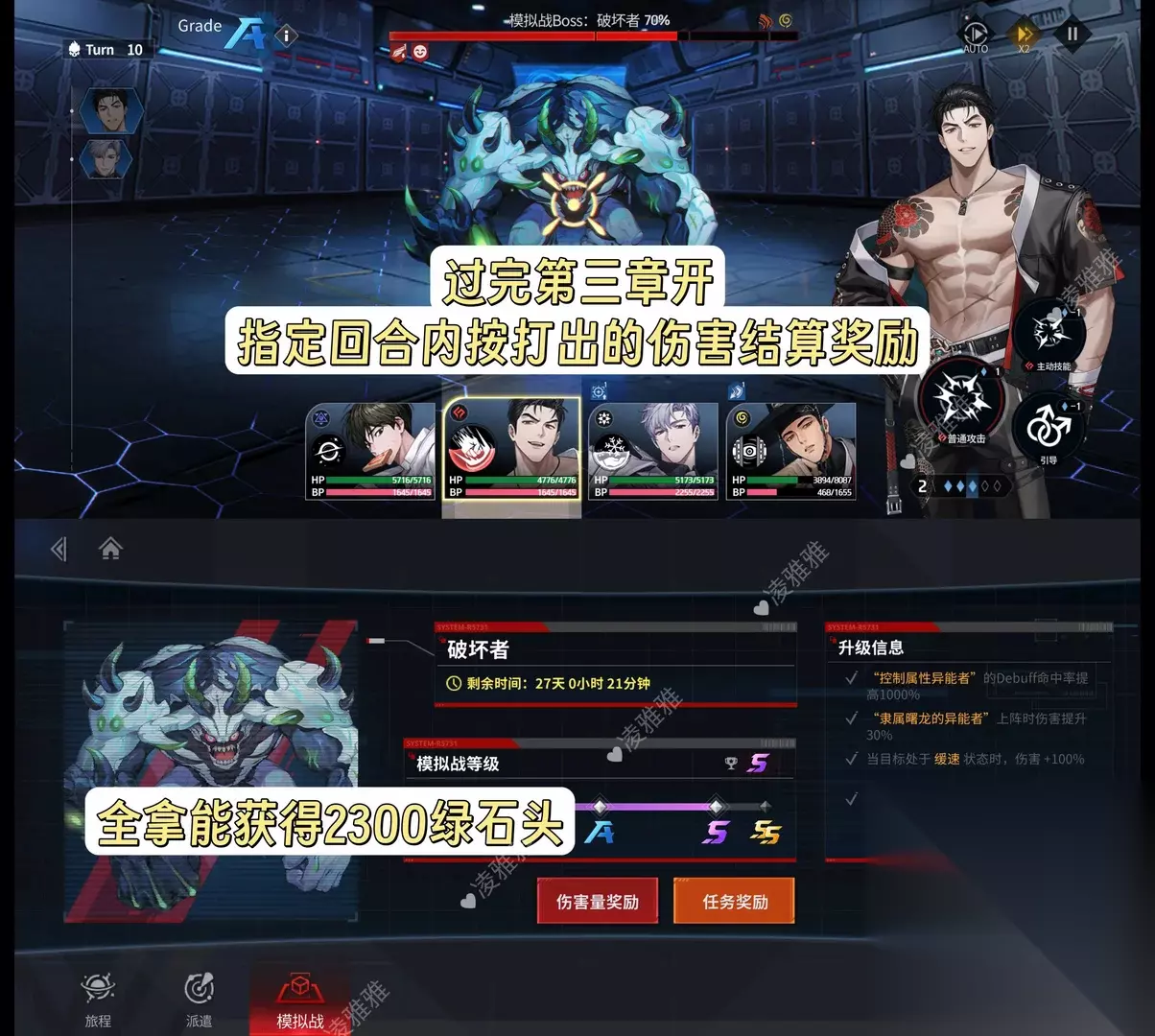 注意事项 ★剧情只有异能者有(需要升级卡解锁) 引导者(也就是专武)只会让引导界面有变化 引导者等级越高越 【卡和专武叠星会有称号(图8),限定如果是自推的话请注意】 ★提前结束战斗不消耗体力,体力是10分钟回10点,2.5小时回满 ★关于抽卡需求,看个人。你如果只看剧情不怎么氪金建议只拿异能者 不想卡关就去氪资源礼包升级卡,前期异能者叠星提升不大,先直接升等级和专武