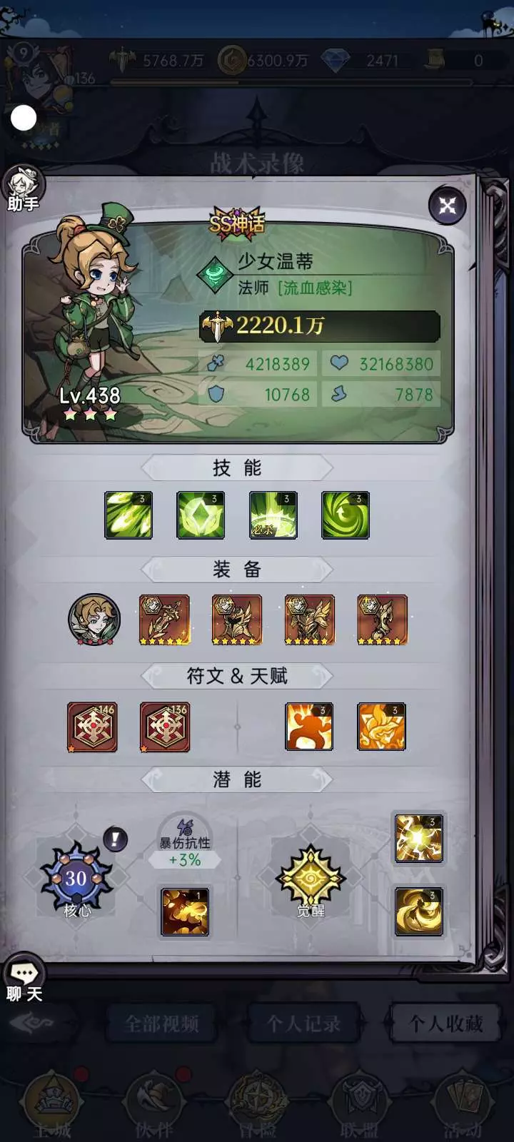 以上是数据图和小号主c的养成情况。我的两个主c战力在1200万左右,不过对面的符文和魔偶都不是很好,所以侥幸打赢了。