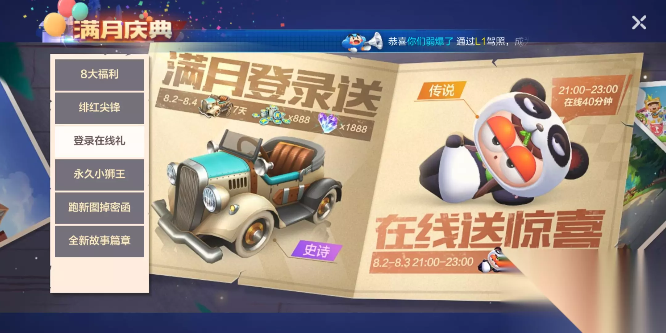 跑跑卡丁车手游免费宝宝获得方法 这次满月庆每个玩家都能得到传说级赛车手熊猫宝宝,相信不少的玩家已经迫不及待了,想要获得宝宝其实非常简单,只需要8月2日或8月3日晚上九点到十一点之间在线40分钟就可以咯,不需要玩家充钱,不需要你不停的刷任务,只要你在线就能得到熊猫宝宝,虽然只有十天的时间,但毕竟是免费的大家可以尝试一下。另外现在不知道能不能两天都在线得到两次熊猫宝宝。