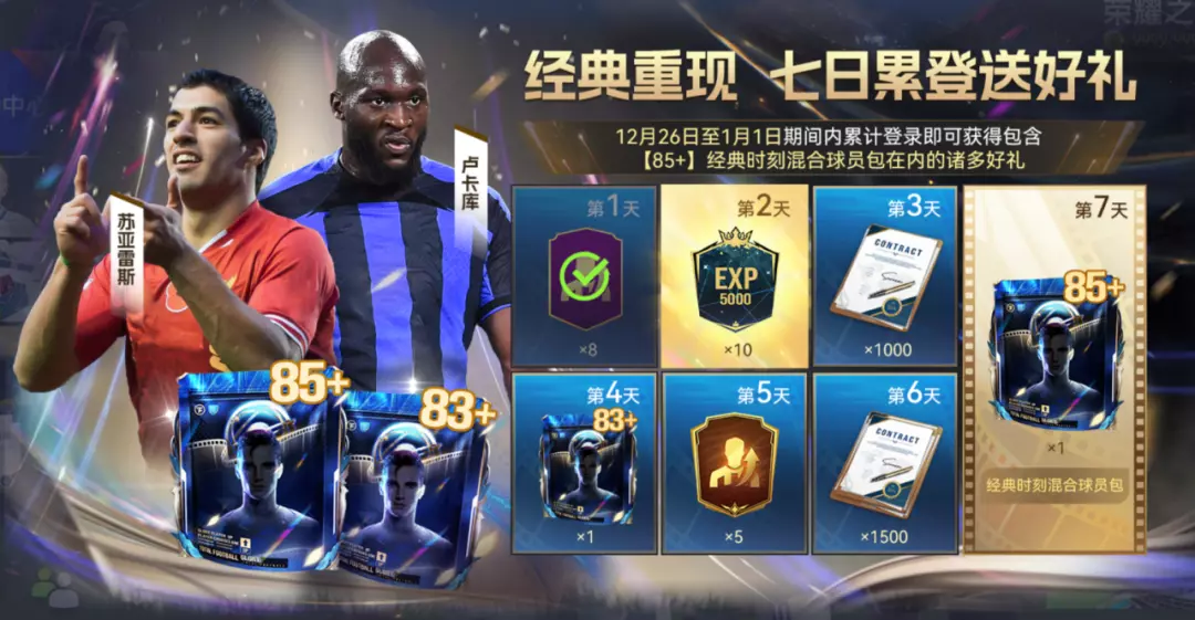 12月26日至1月1日期间累计登录即可领取包含【85+】经典时刻混合球员包在内的诸多好礼。经典时刻主题球员第二期重磅登场!连续七日登录,不只是简单的签到,更是一次与经典并肩前行的时光旅程。当熟悉的瞬间重新汇聚成阵容力量,各位主帅的球队,也将在年末迎来一次真正意义上的“经典升级”!