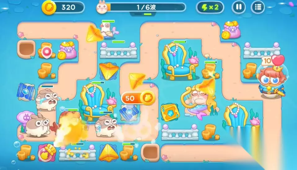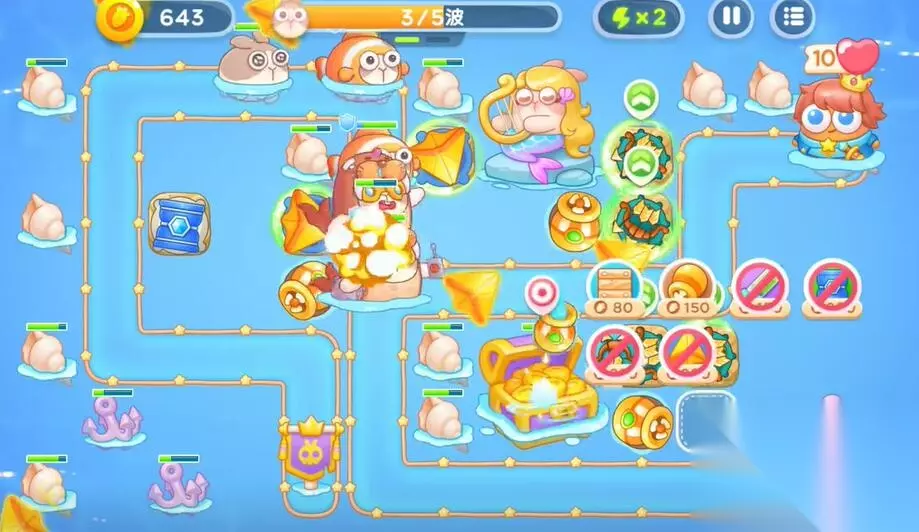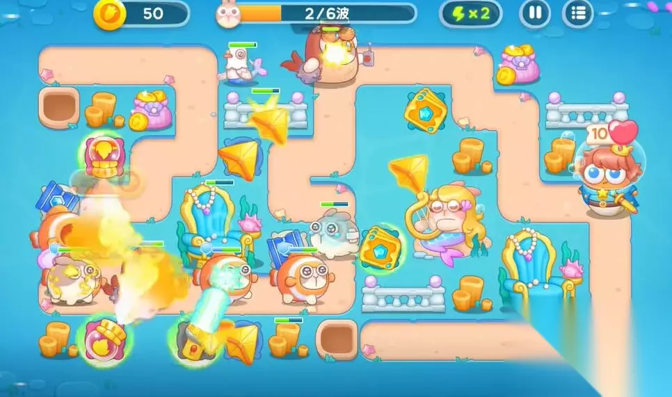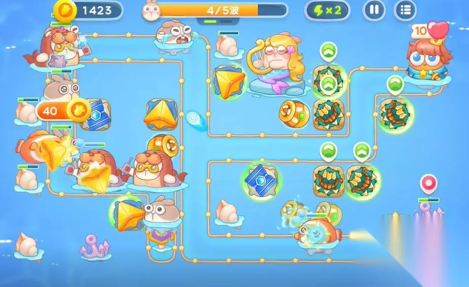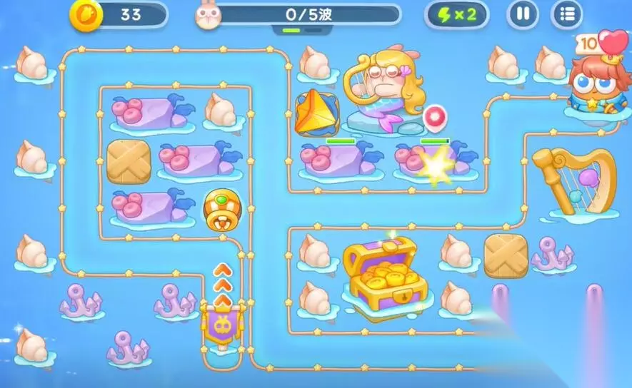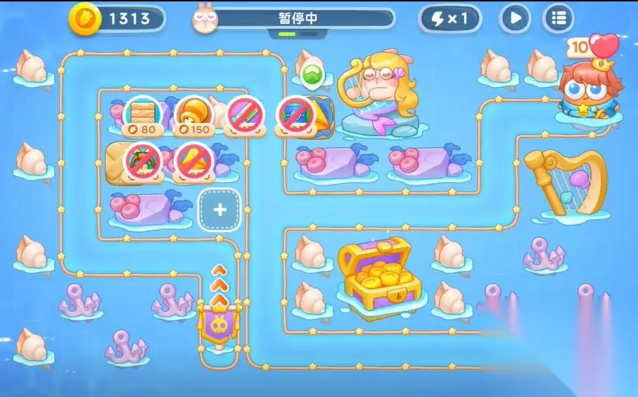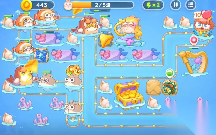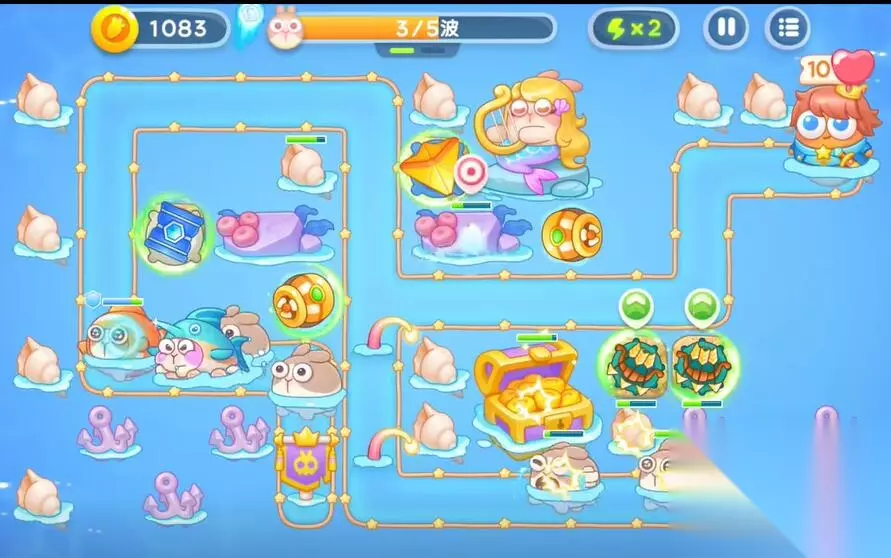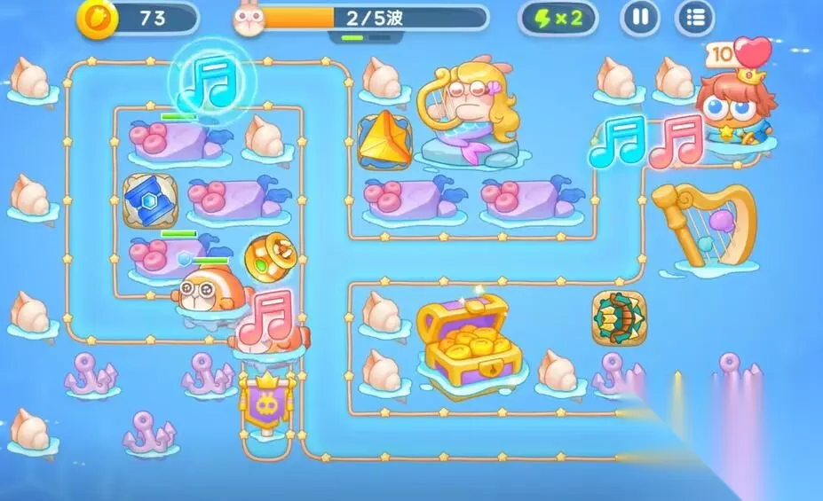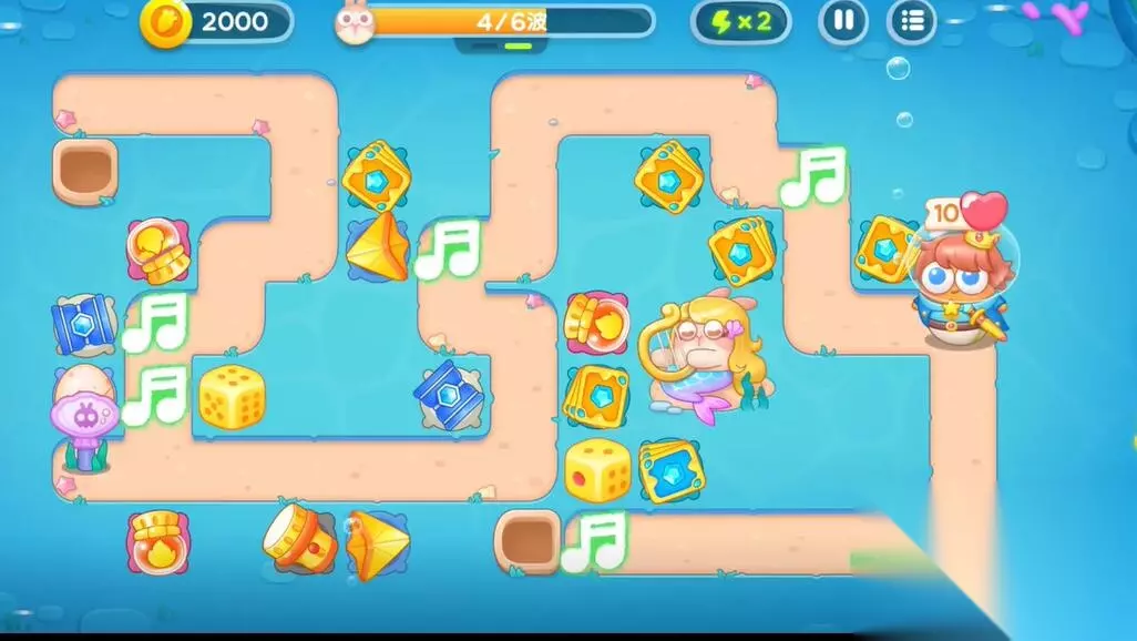 4、在右侧建造一个鱼雷和第二个多重箭塔,利用音符的buff来清理障碍物和兔子。