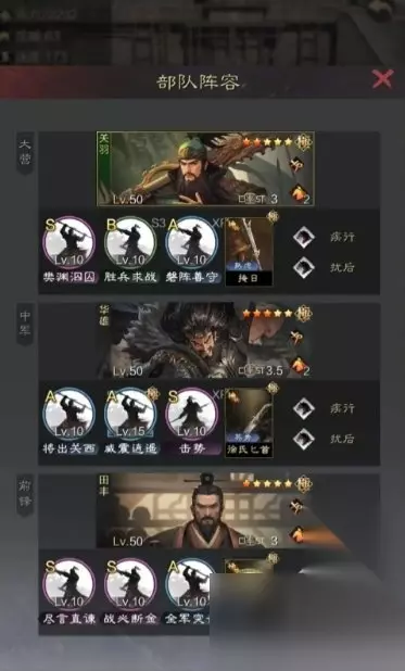 前锋田丰 前锋是一员强力的武将,一经出现便深受广大玩家喜爱。众所周知,率土之滨里,最强力,最广泛,伤害最高,效果最好的战法一般都是主动战法,而绝大部分主动战法的痛点就是发动几率!任你伤害再高,输出再猛,效果再丰富,只要放不出来,不发动,你花多少钱都没辙! 这对主动战法们来说,简直就是最大的福音,而且田丰和法正不同,法正的效果只作用于武将自带战法,而田丰则是一视同仁,友方所有战法,只要是主动战法,就可以享受。因此,极大增加了队伍的稳定性 在这一队中,田丰携带【全军突击】+【战必断金】,【战必断金】不必解释,这年头马超马岱这哥俩一个比一个猛,没有【战必断金】遇上多半要完蛋。【全军突击】则是优秀的增伤、解控、伤害三合一的复合战法,多种效果给队伍带来更多增益。 中军华雄 华雄大家都很熟悉,是率土之滨里名声显赫的著名输出武将,熊法官、华雄撸铁等常见主主流队伍都有他。华雄自带战法【将出关西】输出能力极强,而且附带有禁疗效果,让他一下子从众多输出武将里脱颖而出 华雄携带【击势】+【威震逍遥】。一个强力的增伤战法和一个强力的典藏输出战法,什么效果大家一目了然,就是承担输出的重任!结果也很明显,这队强大的穿透力告诉我们,华雄也不负所托哦。 大营关羽 经典武将关二爷,作为游戏、历史两开花,官方、民间都出名的超级历史人物。作为率土玩家,关羽这个武将大家都很熟悉。你可能没有关羽,但你一定挨过关羽的打! 关羽的自带战法【樊渊泅囚】也是非常出色的战法,高额的全军伤害+犹豫效果,让关羽不管在任何时候,都非常适用。 关羽在这一队中,携带【胜兵求战】+【磐阵善守】。由于自带战法已经非常出色,所以关羽不需要携带其他输出战法,只需要【胜兵求战】来跳过自身准备回合,加快轮转。【磐阵善守】则是给队伍提供一个出色的保护性,尽可能避免在遇到高爆发队伍的时候暴毙。 接下来,进入战报参考环节