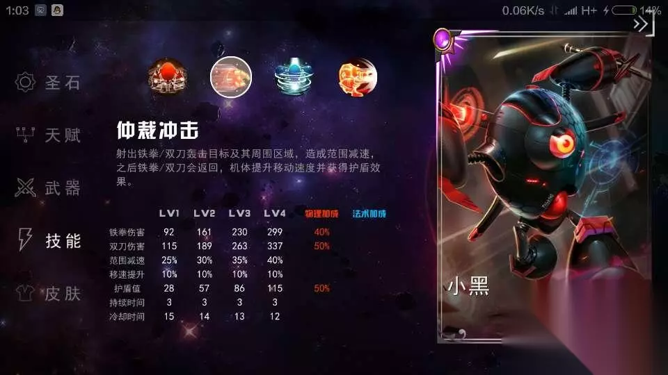 ————————【英雄定位】———————— 近战、物理、坦克、控制 ————————【技能介绍】———————— 【被动技能:动能转换】 普攻为双刀充能,当能量值达到满值时,机体拔出双刀并消耗能量提升攻击速度和攻击距离。拔刀、收刀过程中机体获得伤害减免并眩晕周围敌人。 【一技能:仲裁冲击】 技能伤害:92/161/230/299 物理加成:铁拳:40% 双刀:50% 冷却时间:15/14/13/12 射出铁拳/双刀轰击目标区域,造成范围减速,轰击之后铁拳/双刀会返回机体并且提升机体移动速度和护盾,持续3秒。
