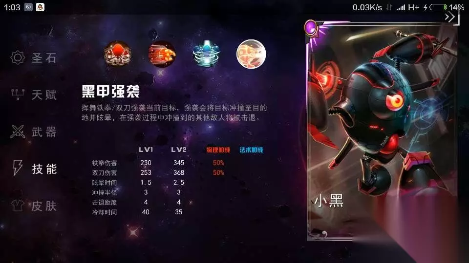 【三技能:黑甲强袭】 技能伤害:230/345 物理加成:50% 冷却时间:40/35 挥舞铁拳/双刀强袭当前目标,强袭会将目标冲撞至目的地并眩晕目标,在强袭过程中冲撞到的其他敌人将被击退。
