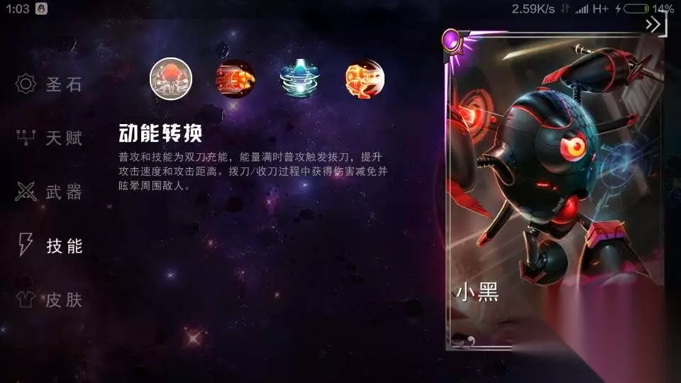 【推荐加点】 一级点二技能,主点二技能,副一技能,有大点大。 ————————【推荐天赋】———————— 【一星:利器专精】 提升5%护甲穿透 可以提升自身的伤害,相比其他两个天赋的作用要好。 【二星:破败游侠】 自身生命值低于50%时将会提高10%的移动速度。 这个天赋可以让小黑的追击能力与逃生能力提高。 【三星:审判降临】 对50%以下生命生命值的英雄造成10%的额外伤害 这个天赋配合二星天赋使用是极好的,可以提升自己的输出能力。 ————————【推荐圣石】———————— 堆护甲穿透跟攻击力能够提高小黑的技能伤害,所以推荐红色用护甲穿透,蓝色护甲,绿色冷却,紫色攻击力。这样套圣石无论在对线还是打野都非常不错,既能提高输出,又能提高前期的防御能力,还可以加快技能的冷却。
