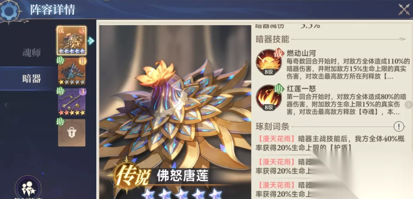 助战能触发真伤的好处在于保值,不会受到其他强力暗器的影响。后面就算出了更强的,佛怒依然在助战坑位中有着一席之地。除了真伤外它第二个亮点在于扣除能量,拉到二星后出战技就有相应机制。拉到七星之后,助战也会有扣除能量的相应机制。燃动每个奇数回合中,都能扣除对面五十点的武魂值。助战的红莲能在头个回合中,扣掉对面五十点数值。对面就算拉到二星解锁增加武魂的被动,也会被我方的两个技能一扣没。