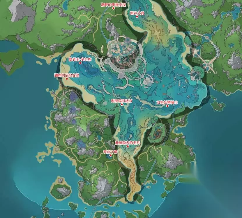 4、铁皮子爵:炽热的洞窟·下层;需要做烫水湖解密,当洞穴内灌满水后才出现 5、隐者王·多尔库:希望之路以北; 6、渐渐隐去的老兵:埃尔顿海沟锚点下方; 7、湖畔的尼尼安涅:厄里纳斯最北部岸边; 8、湖畔的维维安涅:武器本北部断桥处;