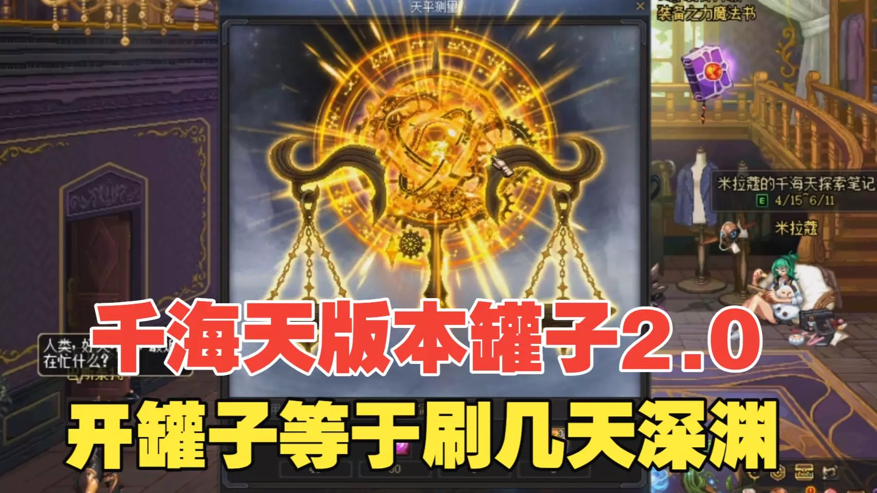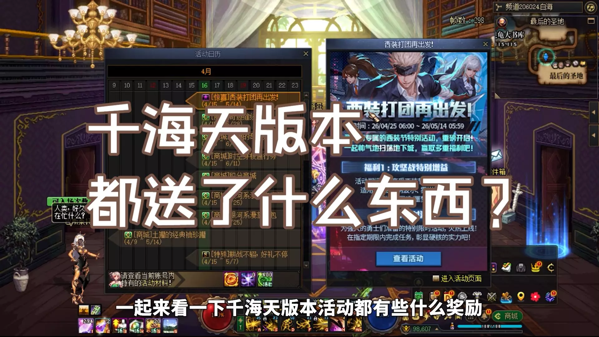 本文汇总DNF千海天版本的游戏福利活动,包括赛丽亚的千海天祝福礼、千海天的冒险小惊喜、米拉蔻的千海天探索笔记,奖励追加11增幅券、天空自选等,活动素材来自体验服,以正式服为准。