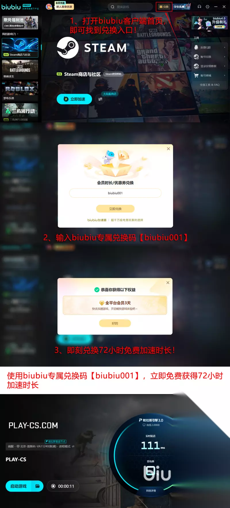 目前新用户注册即可获得24小时免费加速,让新玩家在不同时间段测试丢包变化,其次,所有新老玩家也可通过输入口令【biubiu001】兑换三天免费加速时长,新用户合计96小时体验期,在不同的场景之下不同的时间段,深度体验biubiu加速器的真实效果。目前这也成为pubg冠军选手小叮当推荐的加速器有保障。