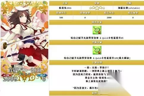 斩首兔女郎2016 自身赋予无敌贯通+Q卡性能提升,非常好用的一张礼装,在对于绿卡性能极为优秀但是没有无敌贯通的从者来讲,这是一张非常好的礼装。而且还是活动礼装啊,肝,肝特么的。