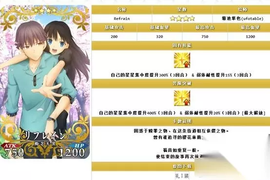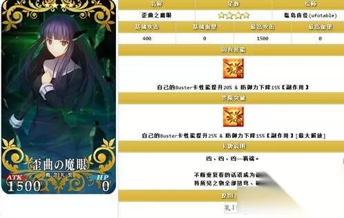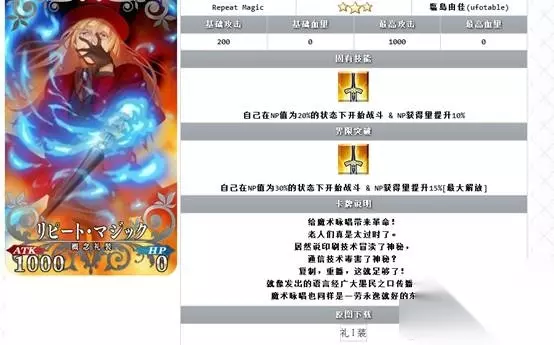 重复魔术 满破之后是一张非常不错的一张礼装,在对于一些NP获取残疾的英灵来说,这个礼装可以拉他们一把,而且更重要的是不占COST,但是毕竟是3X礼装,在之后出的4X5X面前这玩意就是一个替代品了。但是总体来讲还是一张非常不错的礼装。 总结:本次的礼装最亮眼的就是斩首兔,无敌贯通+Q卡性能对于大部分靠Q卡吃饭但是没有无敌贯通技能的英灵来讲就是救星,而且还是活动礼装,值得满破。 但是其他礼装较为一般,不是很值得满破,弄一张收藏就好了