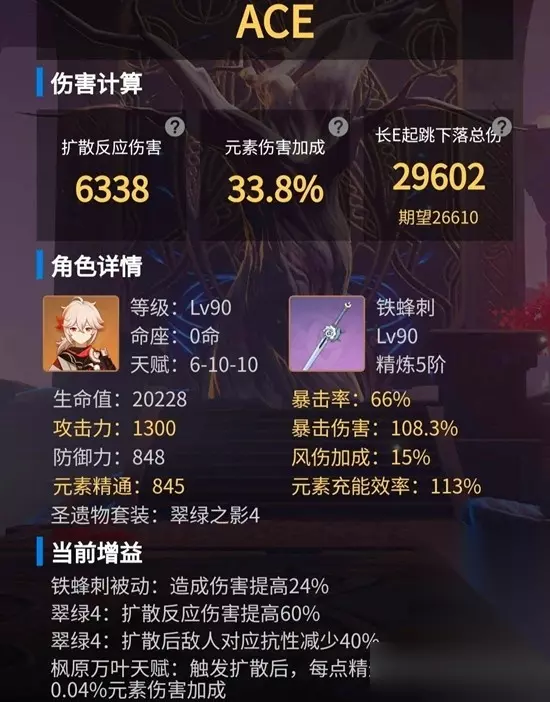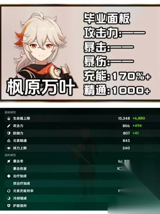 天赋:4-9-9(建议4-10-10) 建议:作为任何队里面都可以带的万油金,万叶是名副其实的最强辅助之一,触发扩散反应的时候,每点元素精通增加队友0.04%的元素伤害加成。相信我,带上他,你的队伍伤害增加得十分显著。