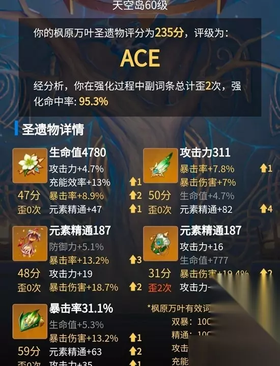 圣遗物:翠绿之影(我的痛苦本)。 五个主词条顺序是生命-攻击-元素精通-元素精通-元素精通。副词条优先元素精通>元素充能,其他副词条不推荐。 提高60%的伤害加成,减少40%的抗性。