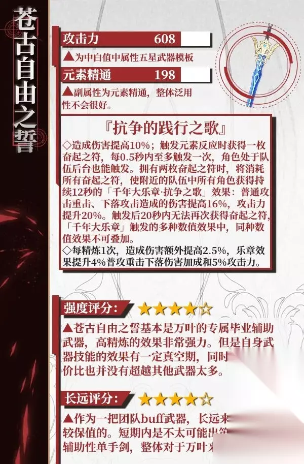 枫原万叶特点:风属性,强烈推荐。无论是什么队伍都可以带万叶,特别强的辅助,加成很高,聚怪能力也强。 武器:专武苍古自由之誓(没打算抽建议用铁峰刺)。升级到90级 铁峰刺主属性是增加元素精通,被动增加24%伤害加成,建议五星。