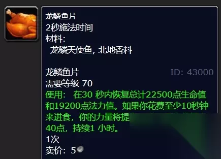 2、龙鳞鱼片:在30秒内恢复总计22500点生命值和19200点法力值。如果你花费至少10秒钟来进食,你的力量将提高40点,耐力将提高40点,持续1小时。