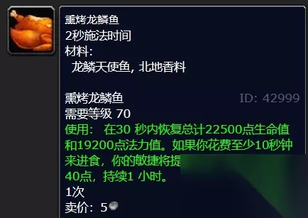3、熏烤龙鳞鱼:在30秒内恢复总计22500点生命值和19200点法力值。如果你花费至少10秒钟来进食,你的敏捷将提高40点,耐力将提高40点,持续1小时。