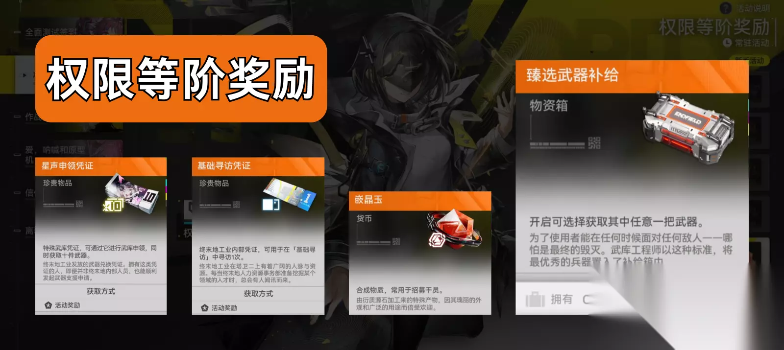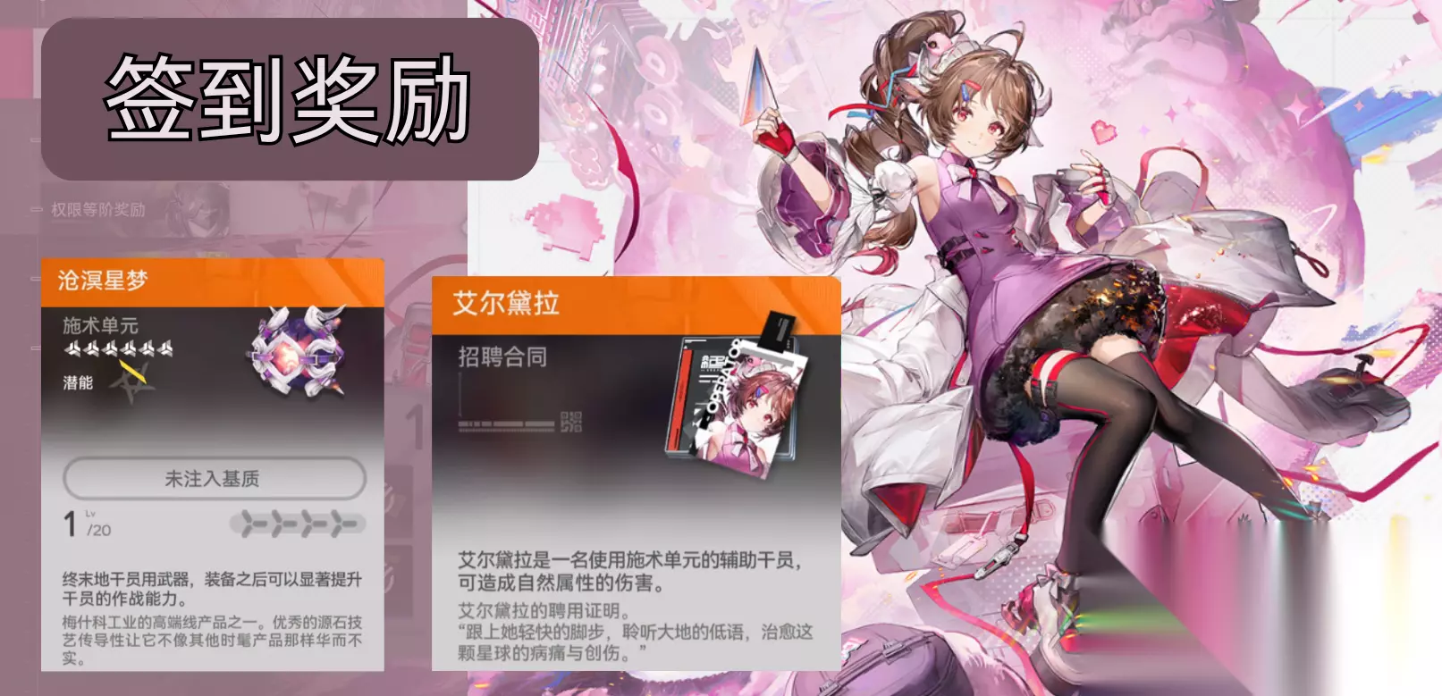 6星干员“艾尔黛拉”、6星武器“沧溟星梦”(“艾尔黛拉”专武)、特许寻访凭证×12 奖励五、权限等阶奖励