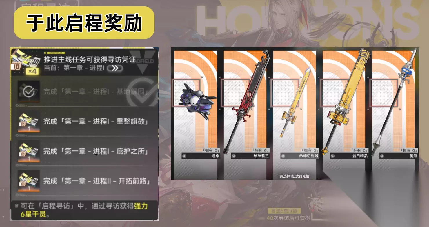 5星干员“昼雪”、5星武器“钟点之声”、基础寻访凭证×20、高级作战记录×20、折金票×30000 奖励三、于此启程