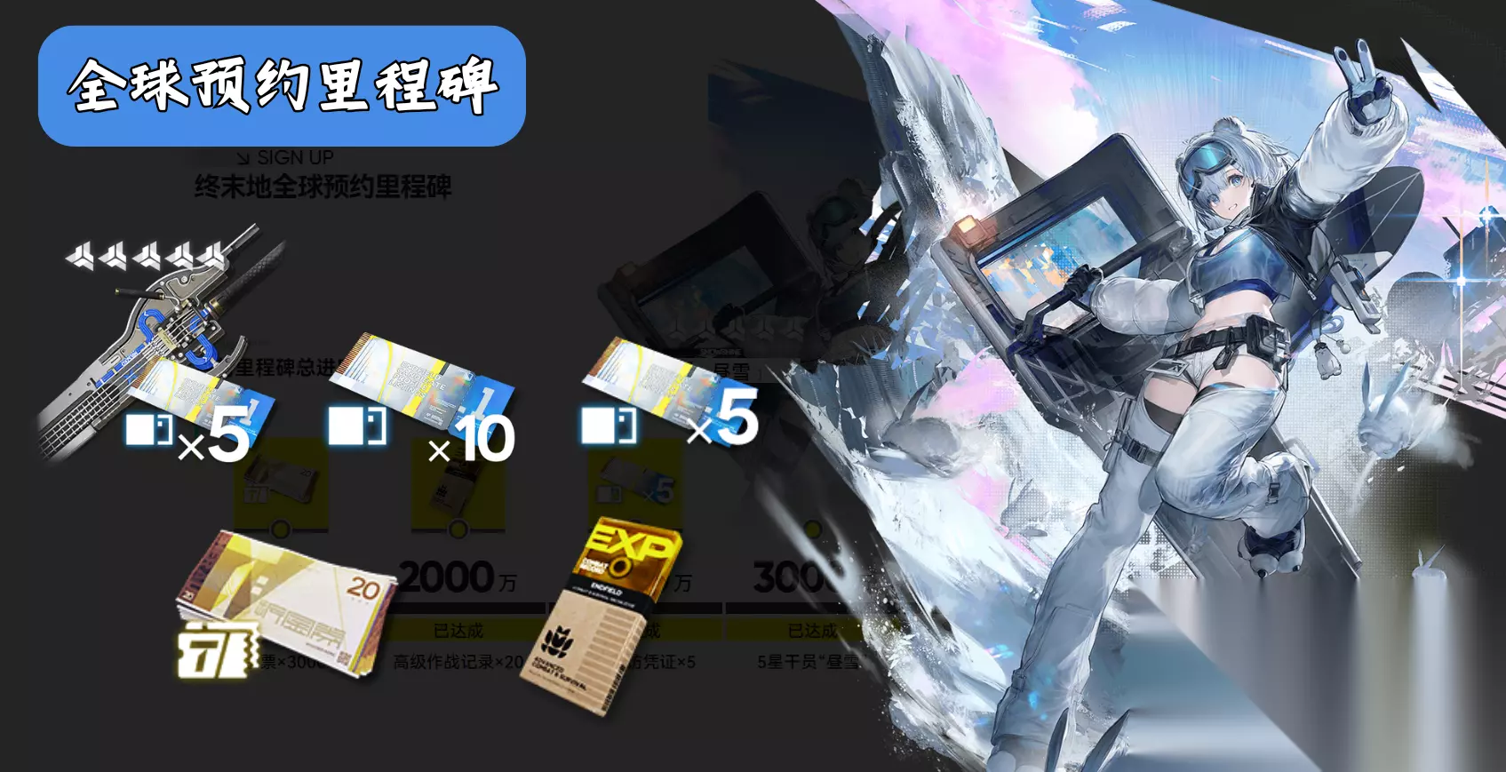 奖励推荐拿“×5000折金票”(比较缺的资源),五星武器可考虑(管理员、陈千语的过渡装备) 奖励二、全球预约里程碑