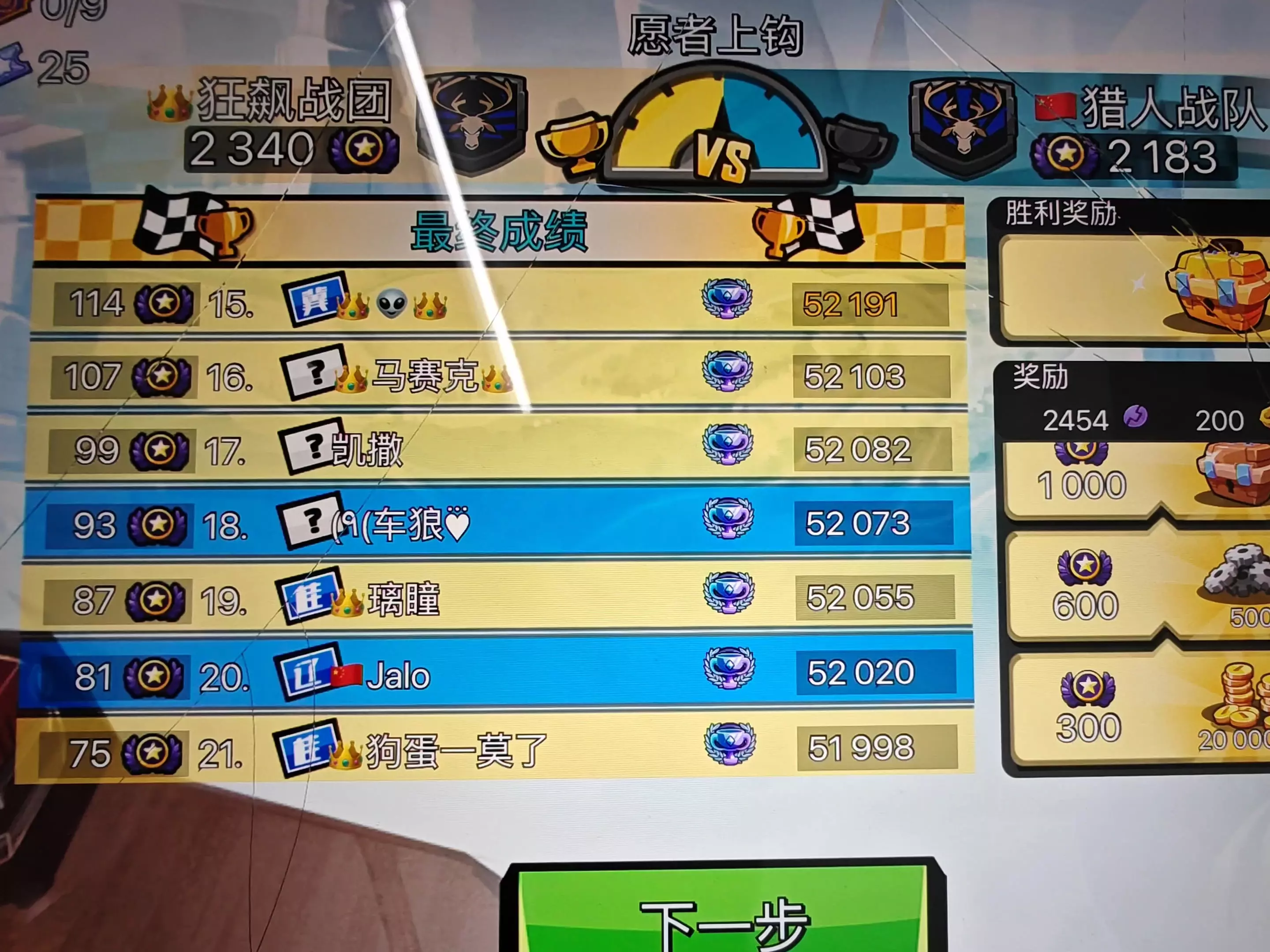 这是《登山赛车2》里狂飙战团与第一王牌赛车手的队赛最终成绩展示,狂飙战团以2510分战胜对手的2007分,还展示了参赛成员的成绩排名与胜利奖励,玩家可获得宝箱、金币等奖励。