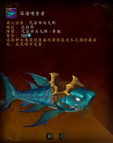 深海喂食者-通过钓鱼在增加个人声望,兑换的坐骑。在7.0新达拉然的外边的一个浮空岛上,玩家可通过集合石查询下,是否有钓鱼团。