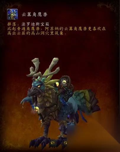 阿苏纳-法罗迪斯宫廷声望崇拜的宝箱-云翼角鹰兽,此地图闲暇之余可多逛逛,因还有其它一只坐骑会出现(稍后介绍)。