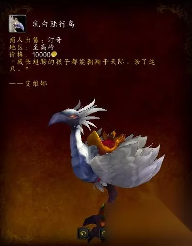 乳白陆行鸟-此坐骑,必须得做了四色隼龙的任务之后,到至高岭-林荫瀑布(32 66)找到NPC艾维娜,对话,拿到个道具,到固定的地方使用杀玩家,当时小编经常杀队友,想起来就搞笑,队友个个懵逼,声望崇拜了才能购买。相当的麻烦。