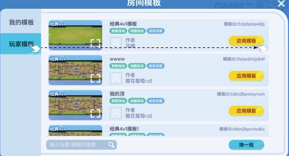 2.按玩家ID搜索:输入作者ID,即可查看该玩家上传的所有模板。