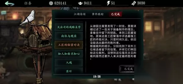 支线:工匠的秘密对决 完成灭法司的残酷美学获取药房钥匙,在药房找到评委,后去石窟密道高手,沉沦谷逆天,无眠街逆天获取遗书。 工匠的秘密对决(完)600元宝+金装图纸 四个选项为,狂,魔,巧,御。只能选一个。