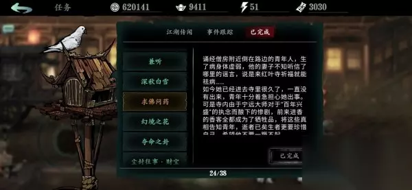 支线:求佛问药 在诵经僧房找到虚弱的青年,剧情通关后任务变化,回到诵经僧房告知其妻子的死讯。求佛问药(完)最高奖励流程