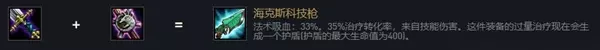 海克斯科技枪 法术吸血:33%。35%治疗转化率,来自技能伤害。这件装备的过量治疗现在会生成一个护盾(护盾的最大生命值为400)。