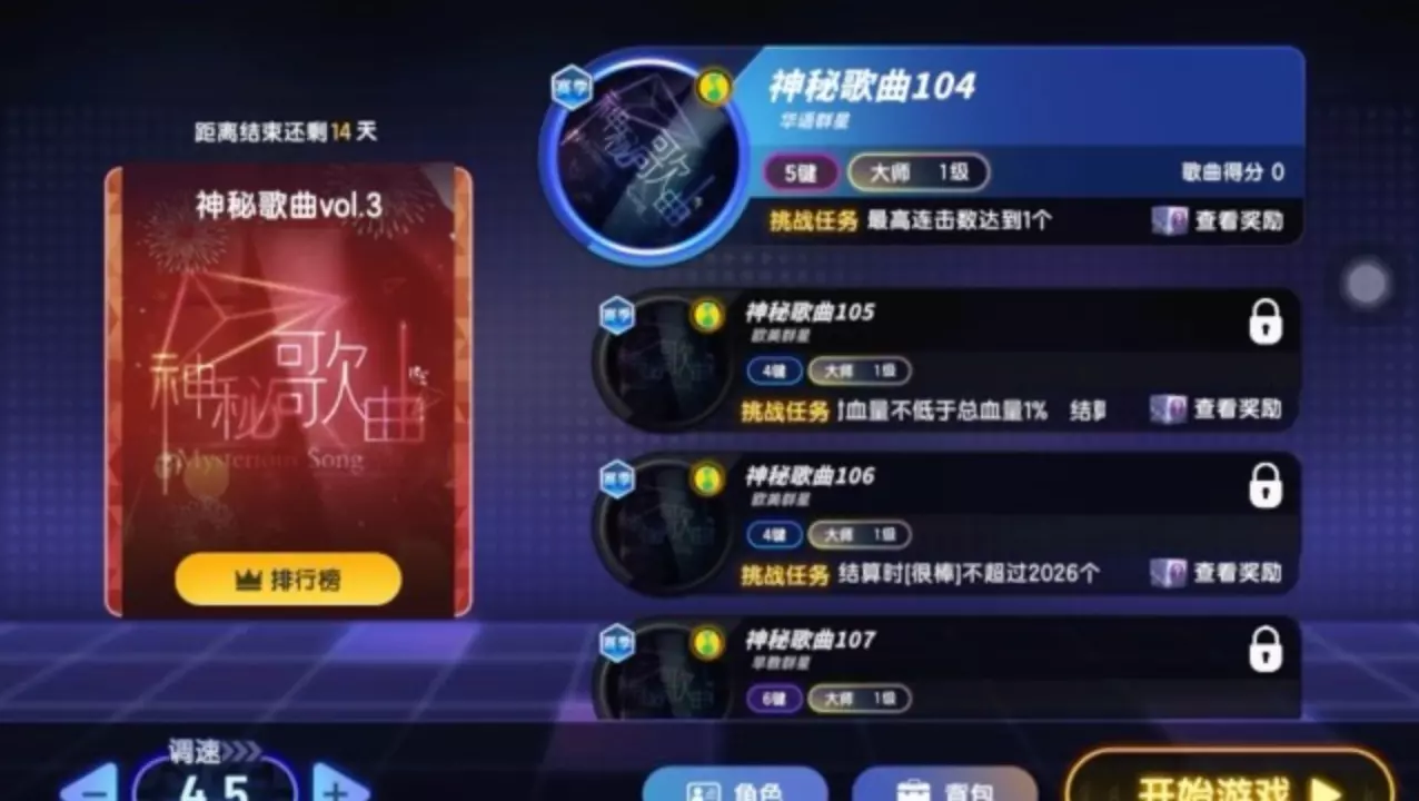 游戏:@节奏大师手游 模式:专辑挑战《神秘歌曲vol.2》 曲目:(可通过「进度条」功能跳转) 《神秘歌曲99》5键-大师-1级 《神秘歌曲100》6键-大师-…